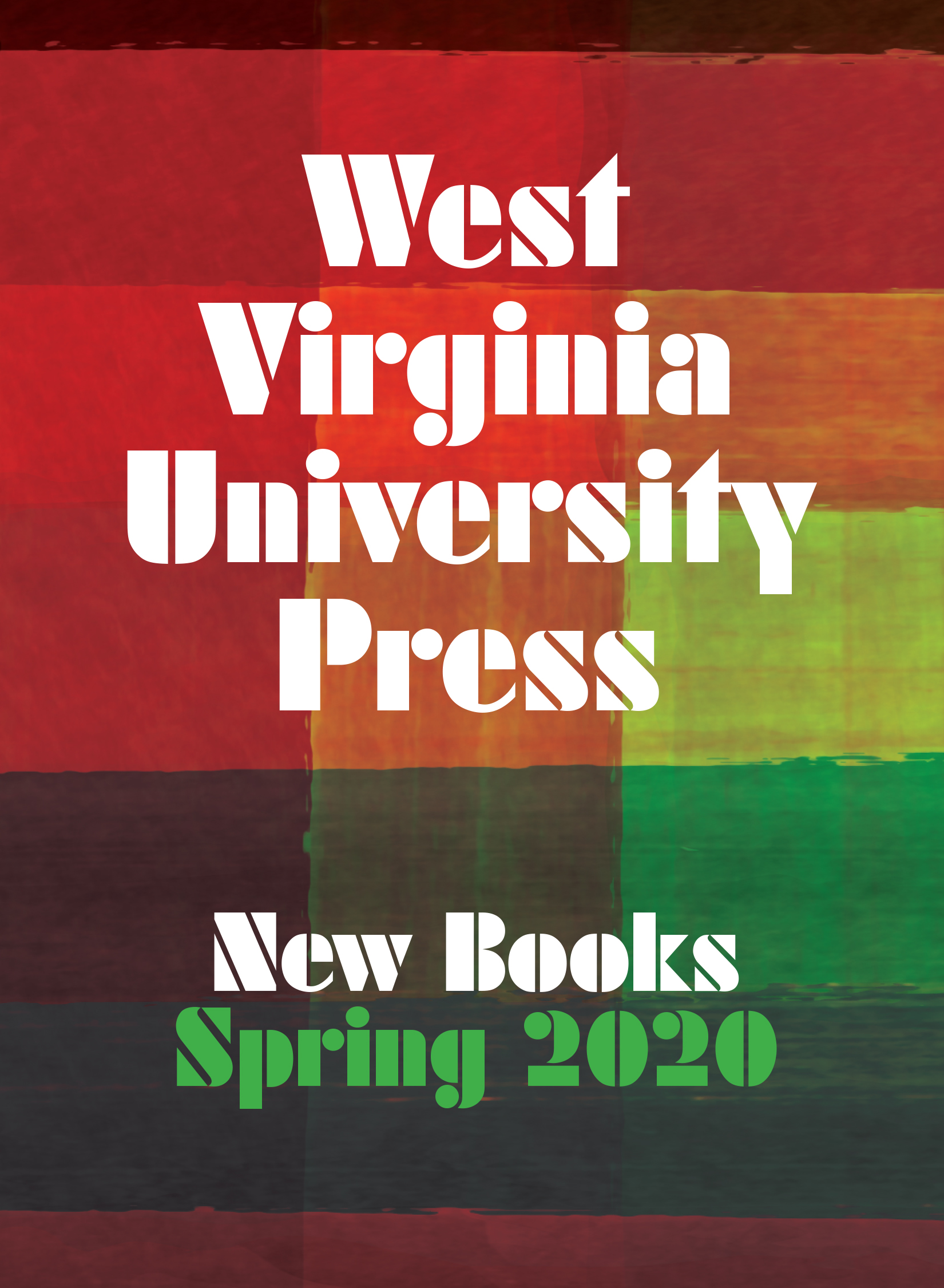 fish-scale tile pattern with color gradient from orange to deep read to blue, text in yellow and white reading New Books Spring 2024, West Virginia University Press, with a red WVU Press logo